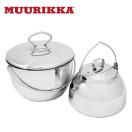 実は、ムーリッカにはケトル0.8Lがスッポリ入るポットがあり、アウトドアセットとして販売されている。ポットでは煮物料理や炊飯などが楽しめる。画像のようにケトルとポットを並べて、直火にあてるとすごくカッコイイ。(ケトルを吊るしている木もなんかズルい)
